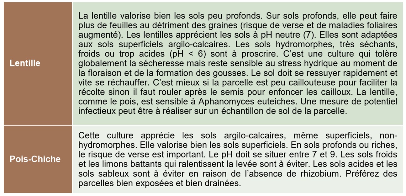 Le choix de la parcelle : Le système racinaire du pois et de la féverole ne descend pas en dessous de 80-90 cm. Il faut donc privilégier des sols à forte Réserve Utile d’autant plus si l’on s’oriente vers des variétés de printemps.