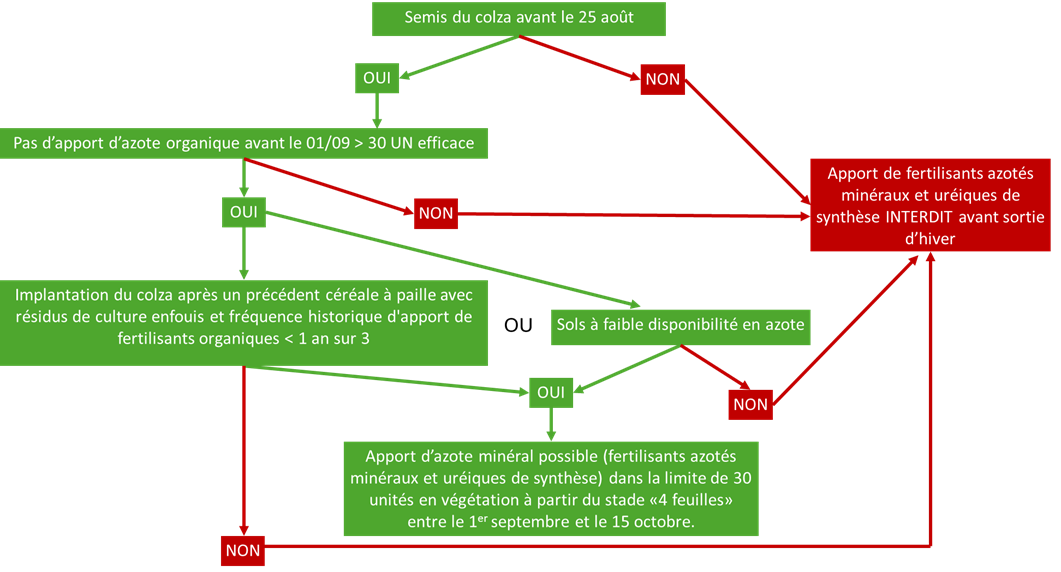 Le 7ième programme d’action de la Directive Nitrates ouvre la possibilité d’apporter de l’azote minéral sur colza de manière très encadrée selon le schéma décisionnel suivant :